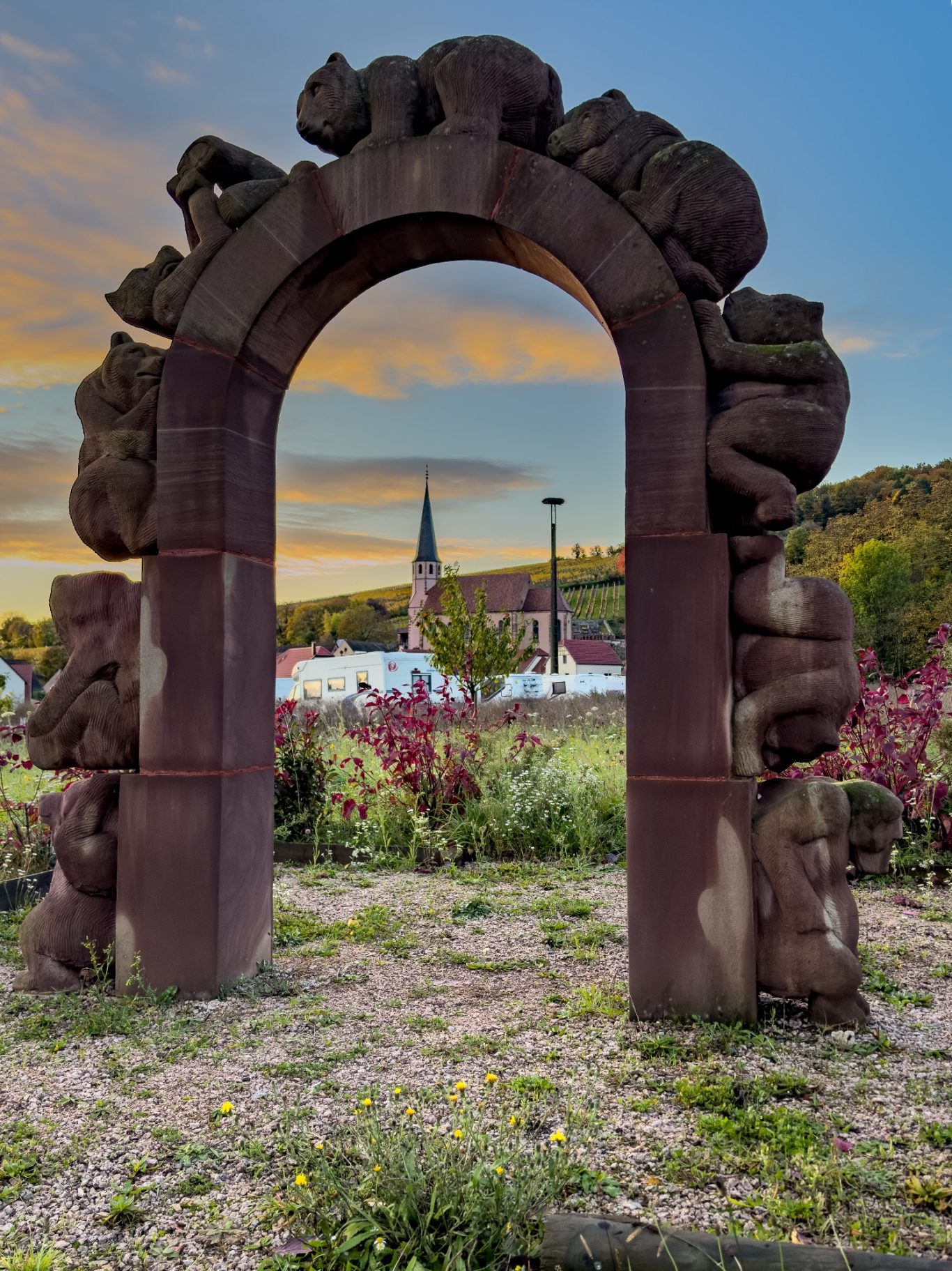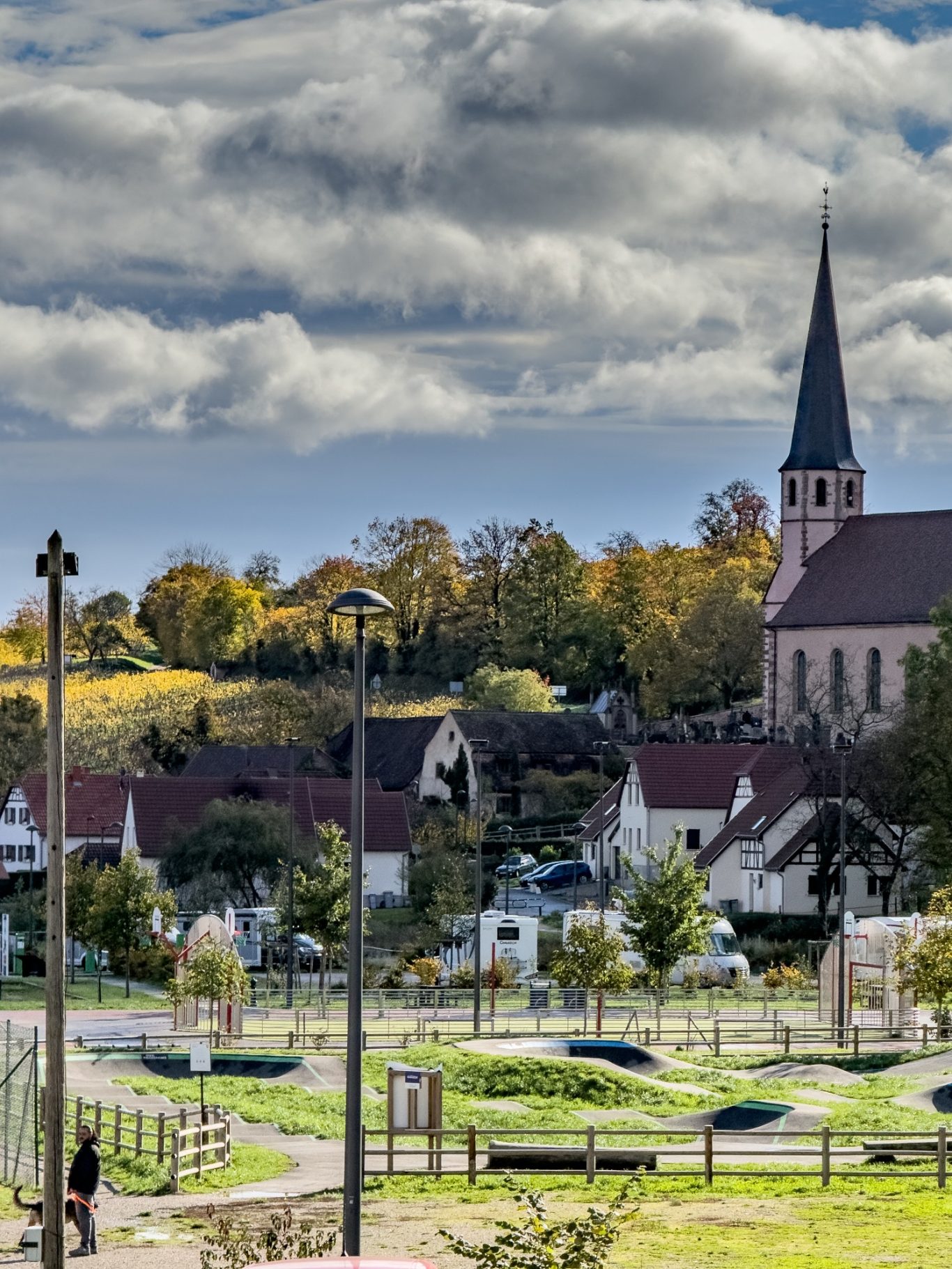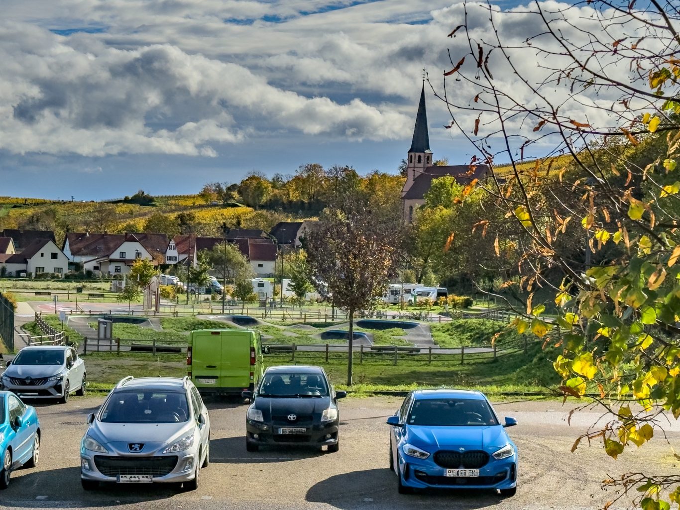 Andlau liegt ebenfalls an der Elsässer Weinstraße zwischen Straßburg und Colmar in einer Senke umgeben von goldgelben Weinfeldern. Und schon bei der Anfahrt sehen wir den im Ort gelegenen Stellplatz. Allerdings wird es recht abenteuerlich, bis wir ihn erreichen. Im Örtchen sind an allen Ecken und Enden die Straßen aufgerissen, es wimmelt von Routes Barrées und von Déviations. Die Gassen werden teilweise besorgniserregend eng, aber Simba zieht den Bauch ein und wir kommen kratzerfrei nach der ein oder anderen Umkreisung des Stellplatzes auf selbigen. Auch hier sind wieder Spielplatz und Fahrradübungsplatz die Nachbarn.