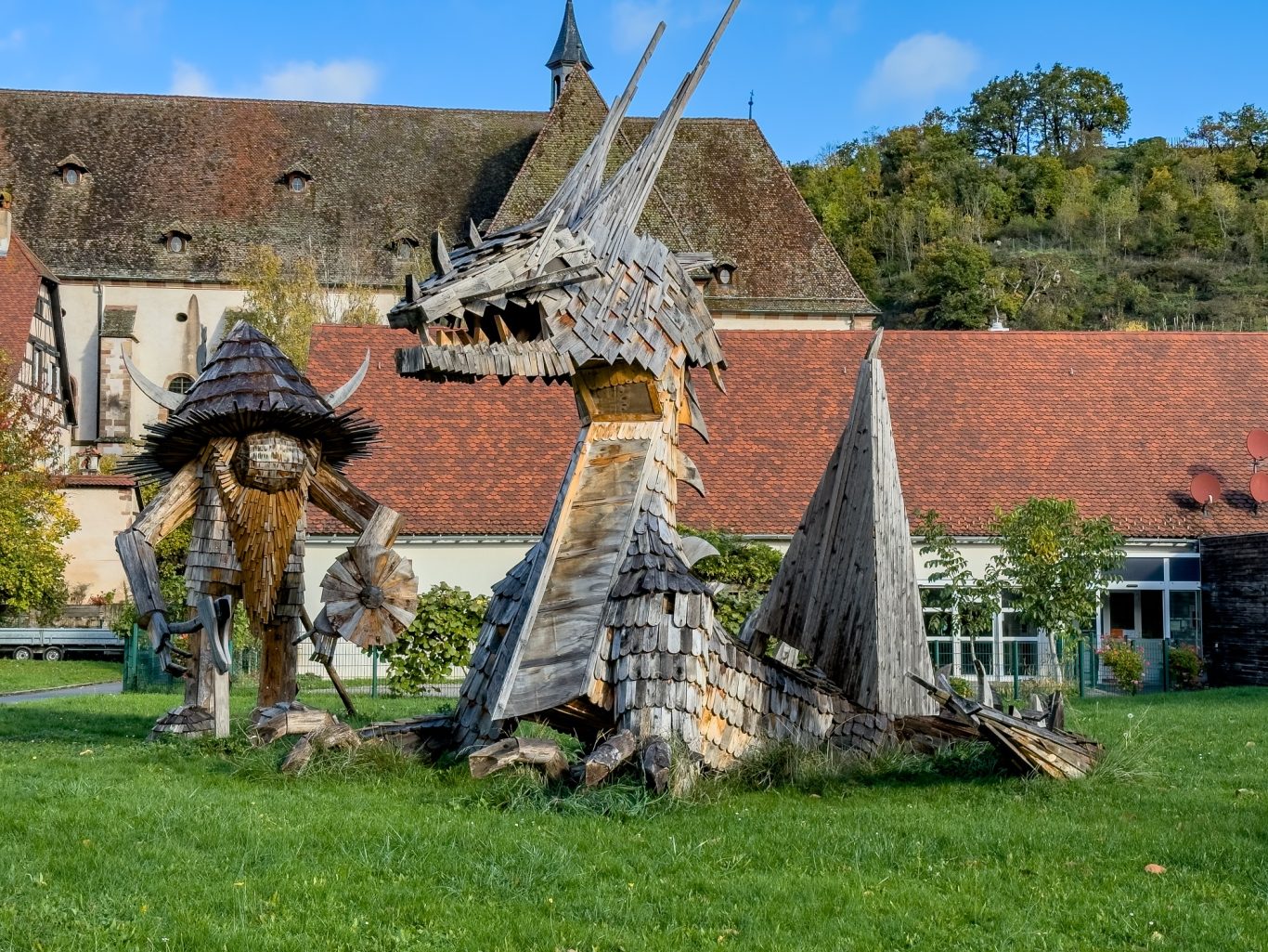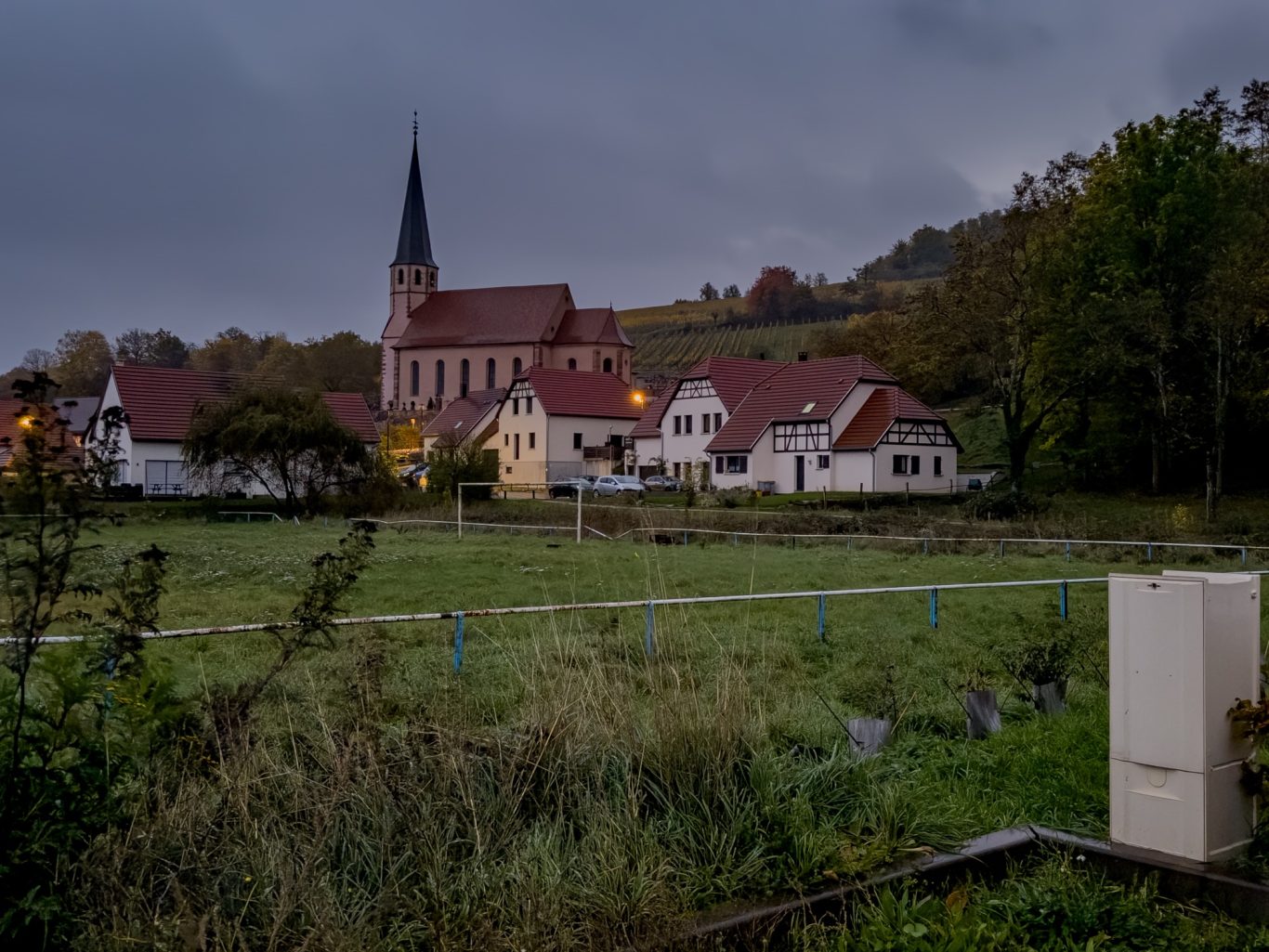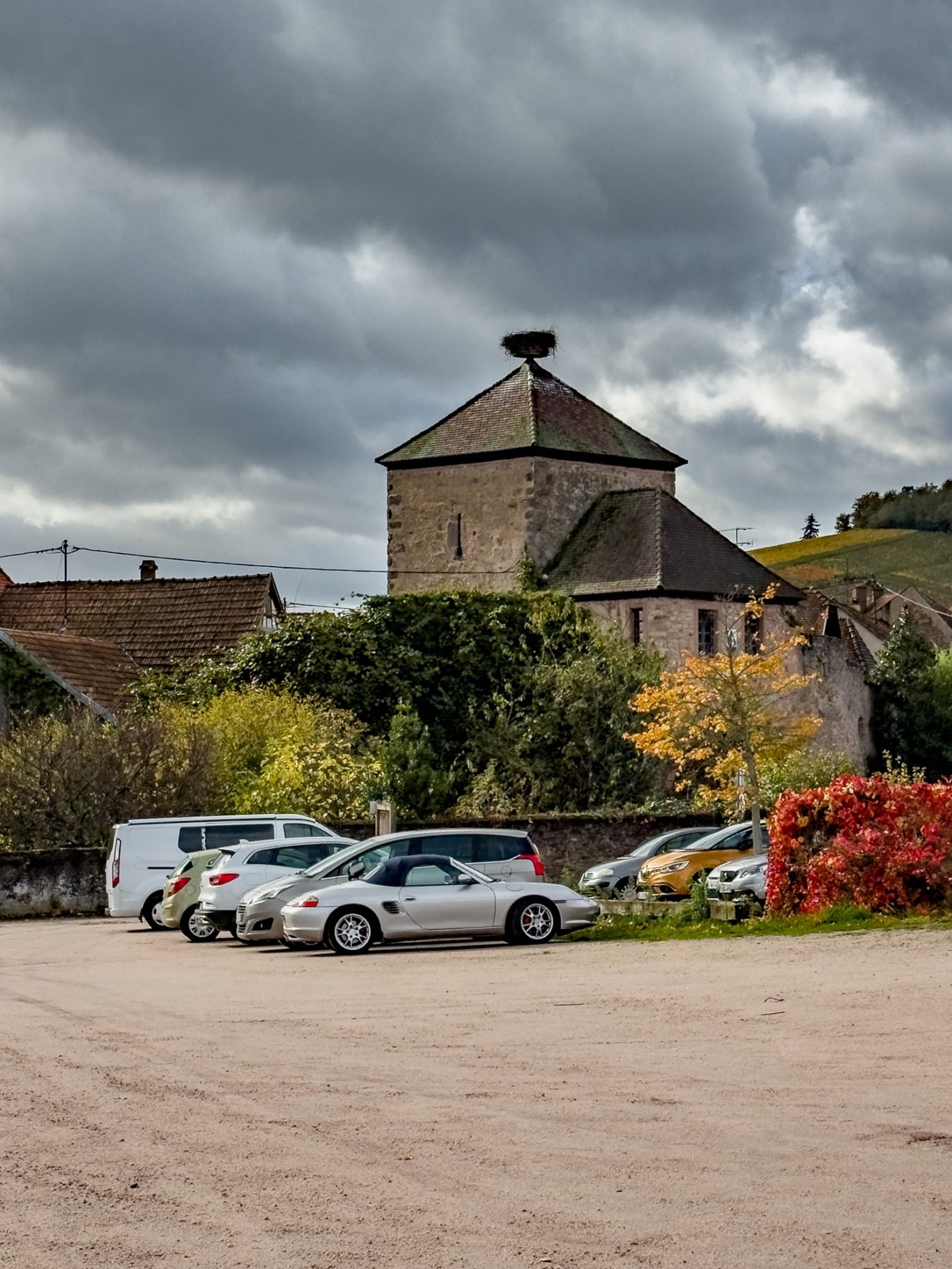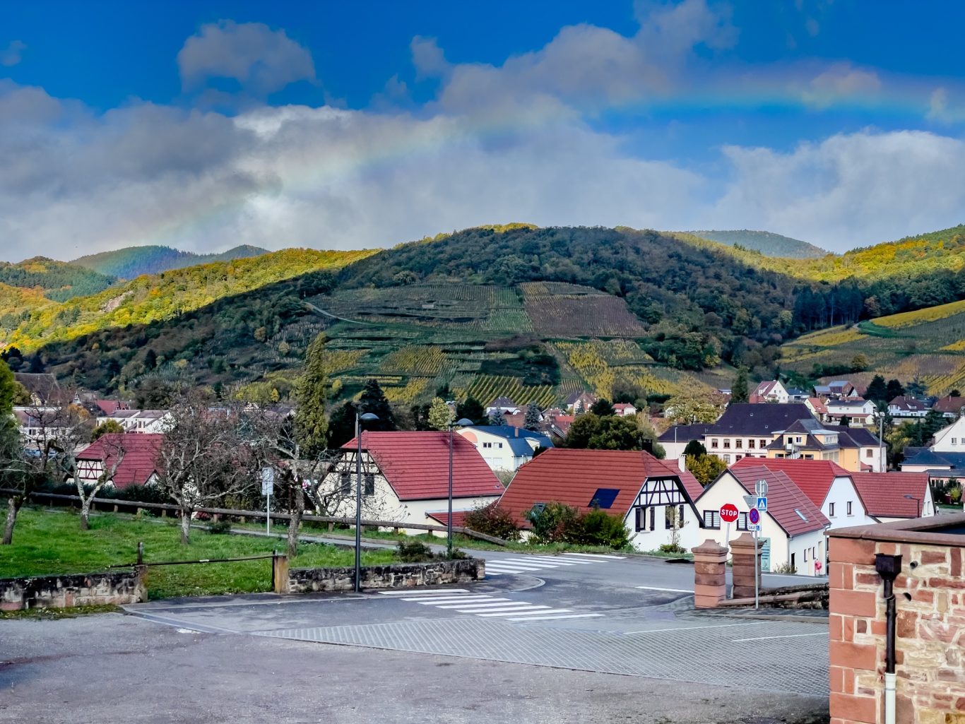 Andlau liegt ebenfalls an der Elsässer Weinstraße zwischen Straßburg und Colmar in einer Senke umgeben von goldgelben Weinfeldern. Und schon bei der Anfahrt sehen wir den im Ort gelegenen Stellplatz. Allerdings wird es recht abenteuerlich, bis wir ihn erreichen. Im Örtchen sind an allen Ecken und Enden die Straßen aufgerissen, es wimmelt von Routes Barrées und von Déviations. Die Gassen werden teilweise besorgniserregend eng, aber Simba zieht den Bauch ein und wir kommen kratzerfrei nach der ein oder anderen Umkreisung des Stellplatzes auf selbigen. Auch hier sind wieder Spielplatz und Fahrradübungsplatz die Nachbarn.