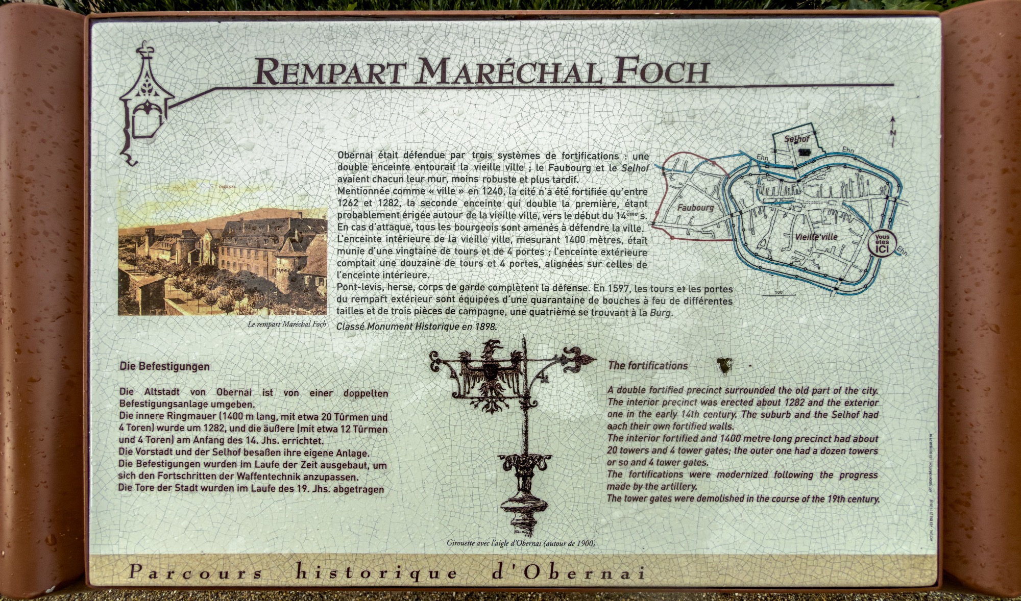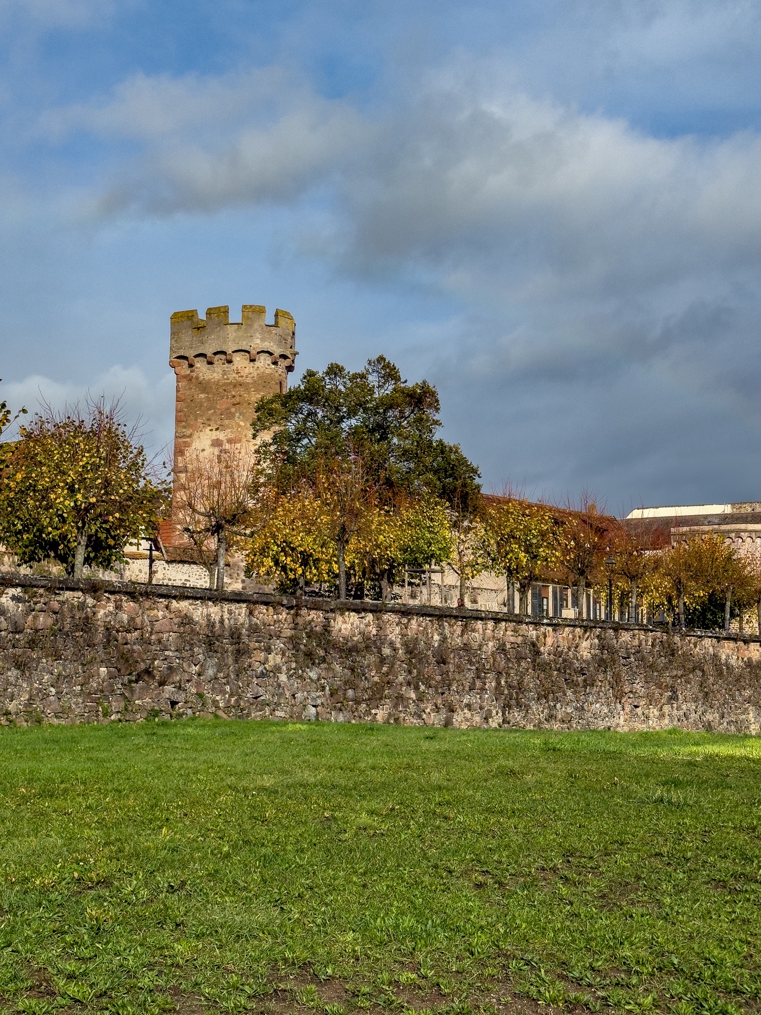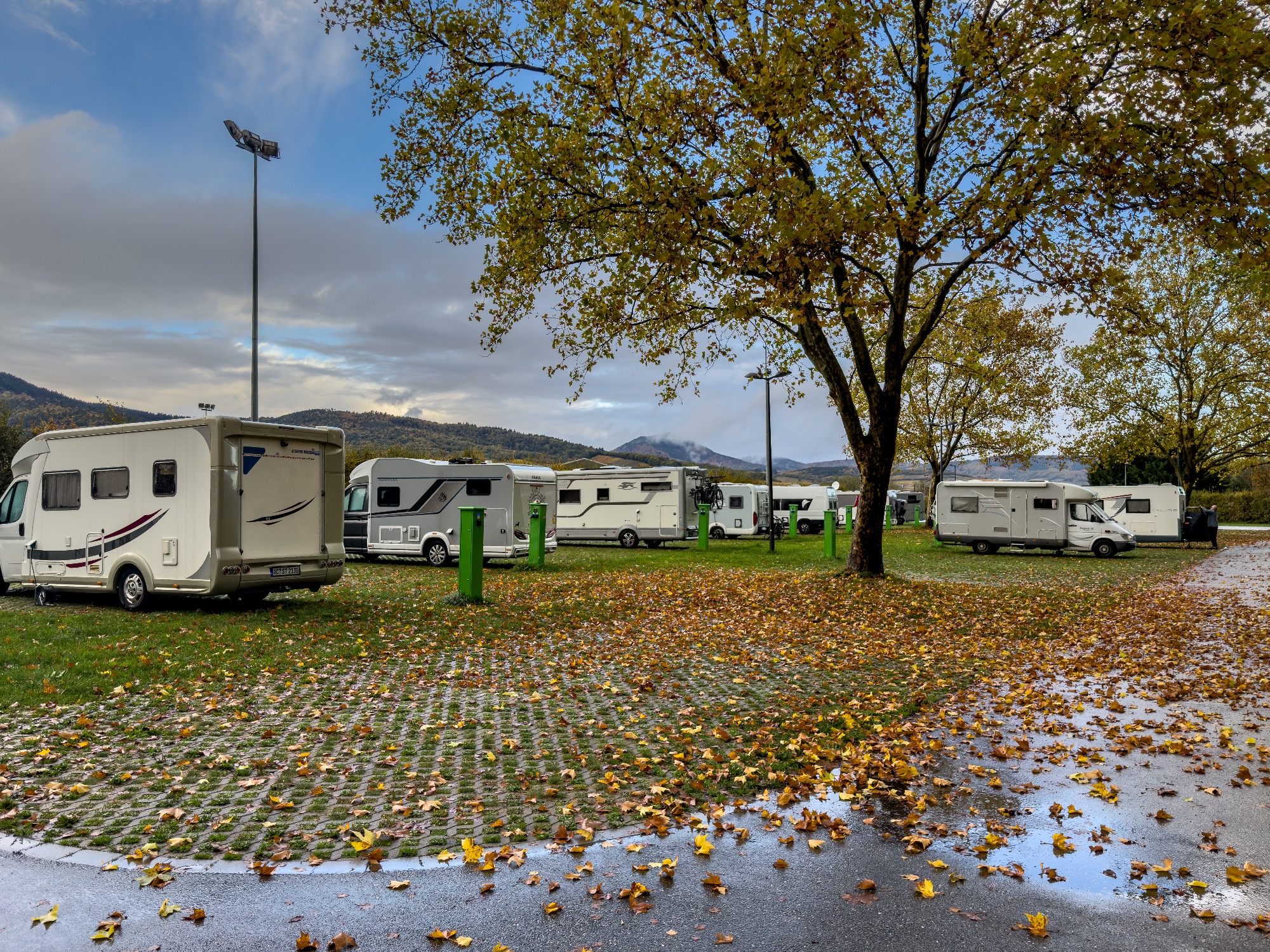 In Obernai gibt es keinen Platz von CCP, aber die Stadt bietet zwei große Parkplätze an, auf denen in einem jeweils abgegrenzten Bereich Wohnmobile kostenfrei stehen und übernachten dürfen. Einen dieser Plätze steuern wir an und stehen zu Fuße der Stadtmauer.