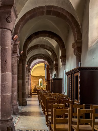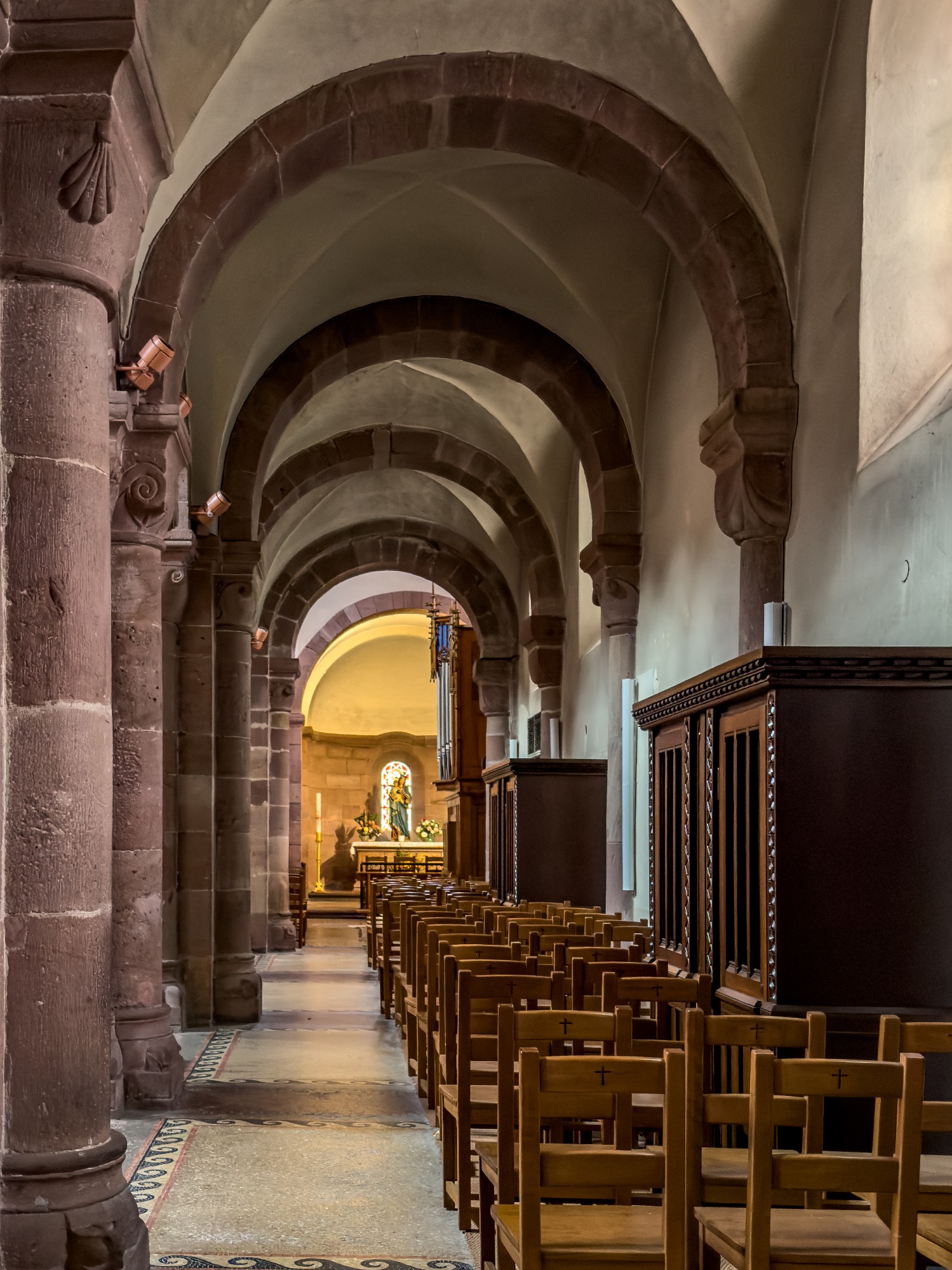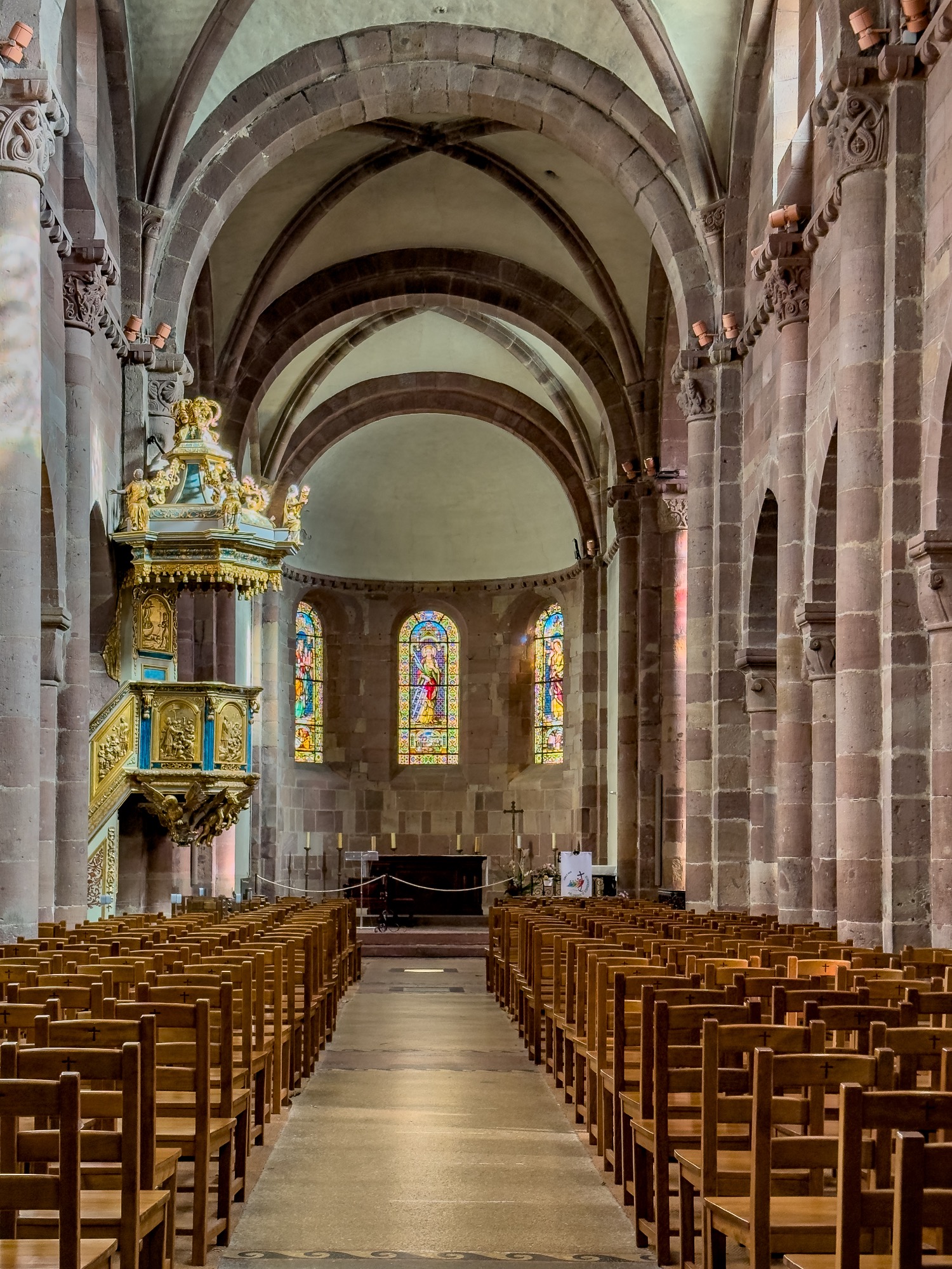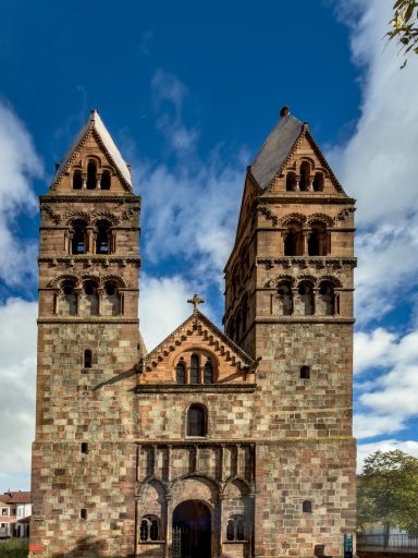 Das gegenwärtig sichtbare Kirchengebäude wurde 1170 bis 1180 mit von Friedrich Barbarossa gestifteten Geldern errichtet und zeichnet sich durch seine stilistische Einheitlichkeit und ausgewogenen Proportionen aus. Der romanische Stil mit seinen quadratischen Elementen und seiner Einfachheit ist gut zu erkennen. Die Kirche wurde aus rotem Sandstein und Granit der Vogesen erbaut. Das Querschiff ragt nur wenig über die Breite des Langhauses hinaus.
