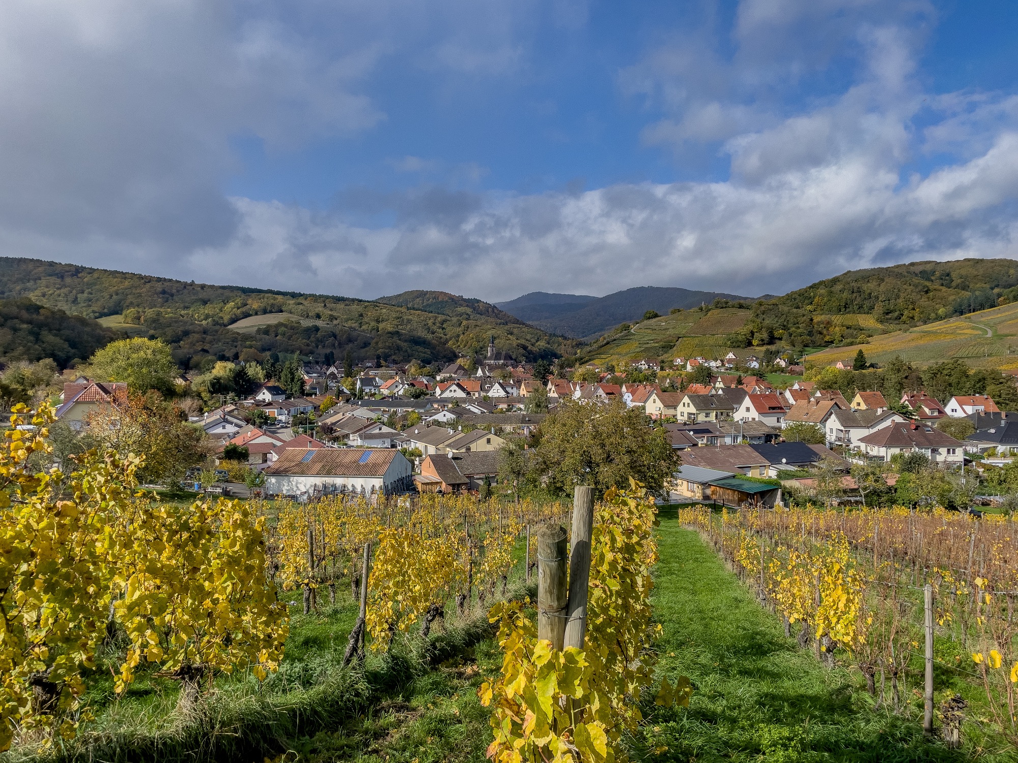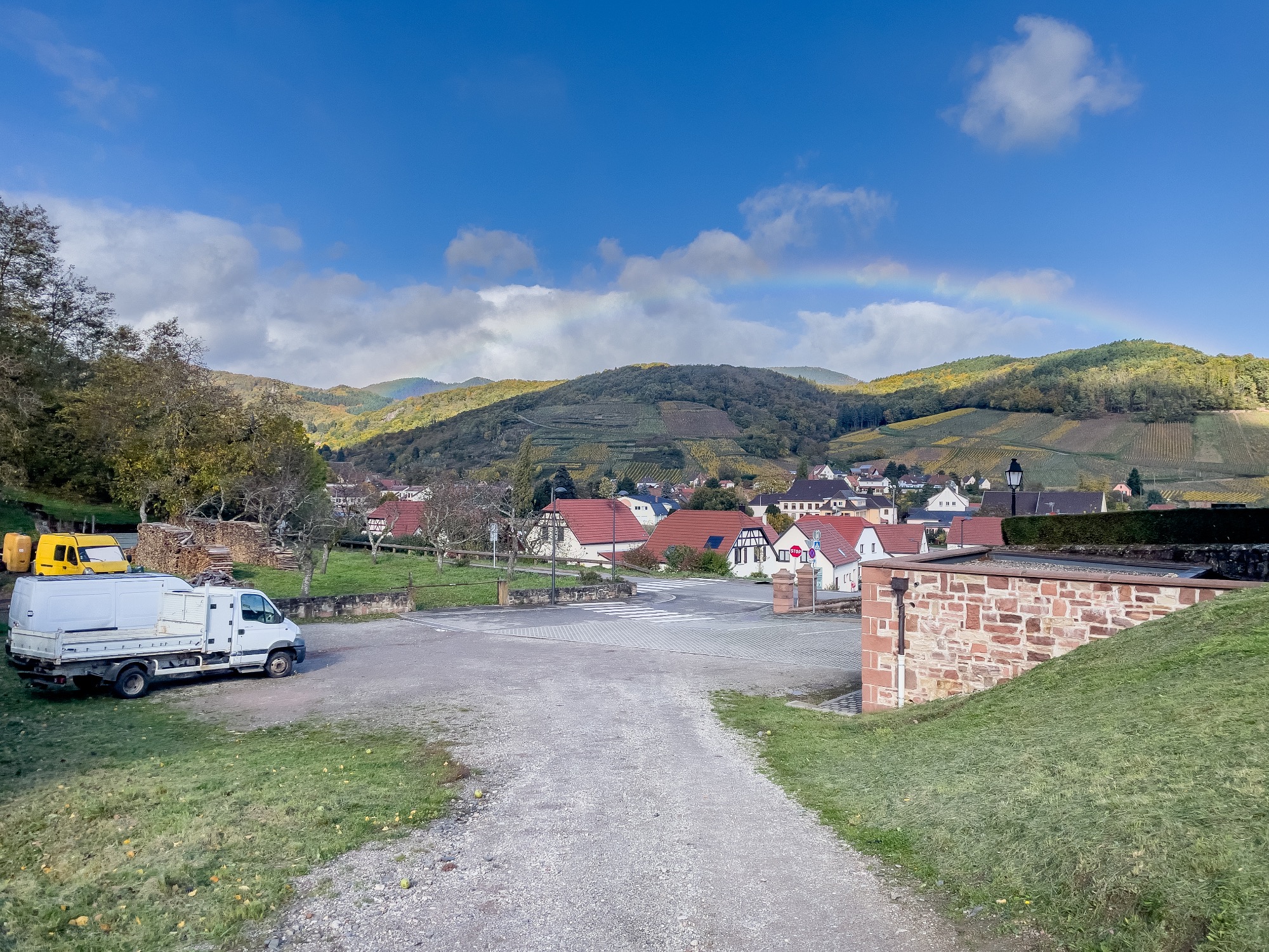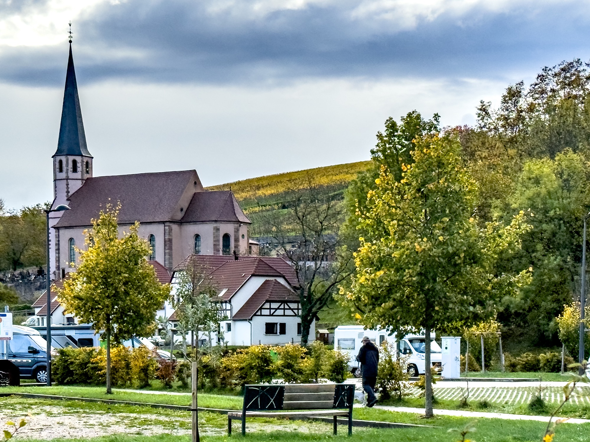 Andlau liegt ebenfalls an der Elsässer Weinstraße zwischen Straßburg und Colmar in einer Senke umgeben von goldgelben Weinfeldern. Und schon bei der Anfahrt sehen wir den im Ort gelegenen Stellplatz. Allerdings wird es recht abenteuerlich, bis wir ihn erreichen. Im Örtchen sind an allen Ecken und Enden die Straßen aufgerissen, es wimmelt von Routes Barrées und von Déviations. Die Gassen werden teilweise besorgniserregend eng, aber Simba zieht den Bauch ein und wir kommen kratzerfrei nach der ein oder anderen Umkreisung des Stellplatzes auf selbigen. Auch hier sind wieder Spielplatz und Fahrradübungsplatz die Nachbarn.