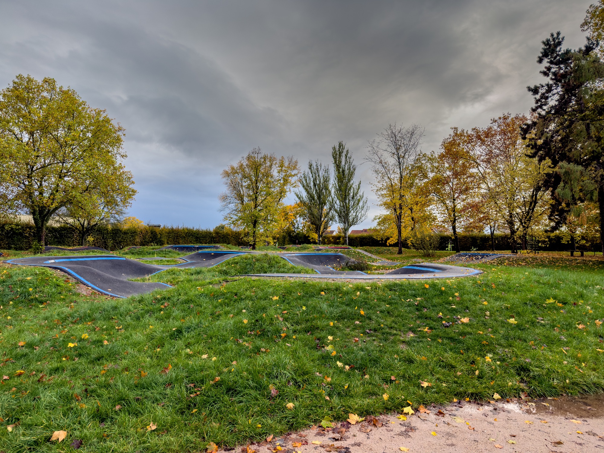 Nebenan gibt es ein paar Outdoor-Fitnessgeräte, einen Picknickplatz und einen kleinen Parcours mit Wellen, Kurven, steileren Gefällen, Steilkurven etc. Diese Plätze gibt es öfter und sie dienen dazu, Klein- und Kleinstkindern die sichere Beherrschung von Fahrrädern näher zu bringen. Eine gute Sache, wie wir finden.